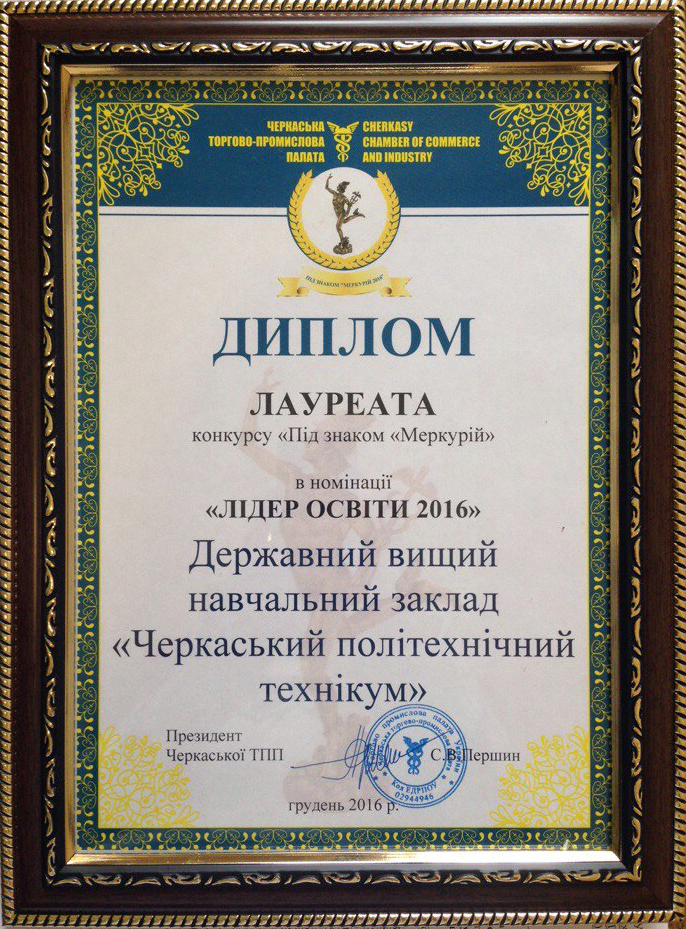 Черкаський політехнічний технікум нагороджено дипломом лауреата зазначеного конкурсу в номінації "Лідер освіти 2016" як кращий державний вищий навчальний заклад, що забезпечує співпрацю з роботодавцями щодо підготовки кадрів для регіонального виробництва.